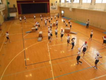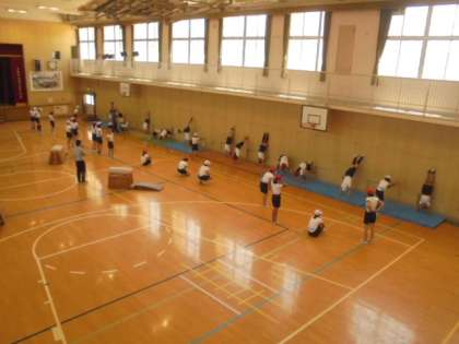 体育館で、跳び箱や倒立などいろいろな運動に挑戦しています。