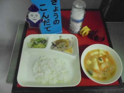 今日の献立は、豚肉のおろしじょうゆかけ、みそ汁、野菜いため、ごはん、牛乳です。