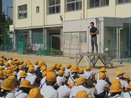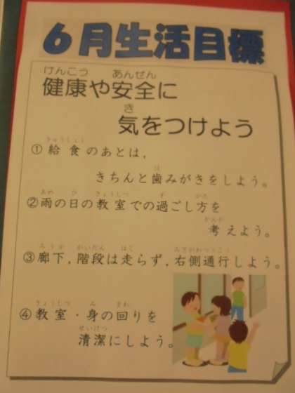 (上)井元先生から、スマホなどネットについての注意喚起のお話です。(中・下)司会の梶原先生からは、あいさつがよかったとほめていただき、6月の生活目標について話していただきました。