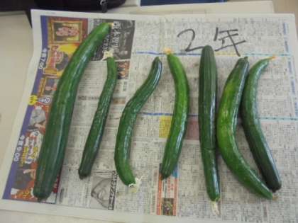 (上)学習園で収穫したきゅうりです。(下)漢字のドリルです。