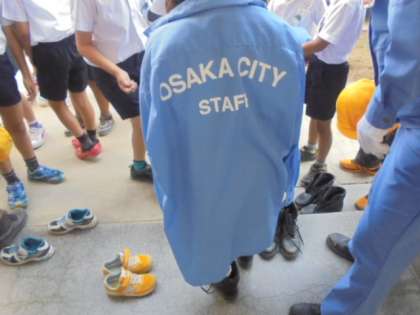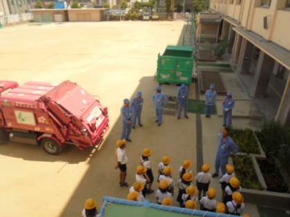 今日は、4年生のために、大阪市中部環境事業センター出張所(浪速区塩草)より、7名の職員の方々がお越しくださいました。パッカー車が実際に動く様子を見せてくださったり、作業用の服や靴を貸してくださったりして、子どもたちは大喜びでした。皆さん、ありがとうございました!
