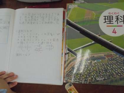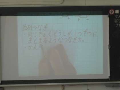 (上・中)理科で、直列つなぎと並列つなぎを学習しています。(下)教室に、夏休みの課題図書が紹介されていました。