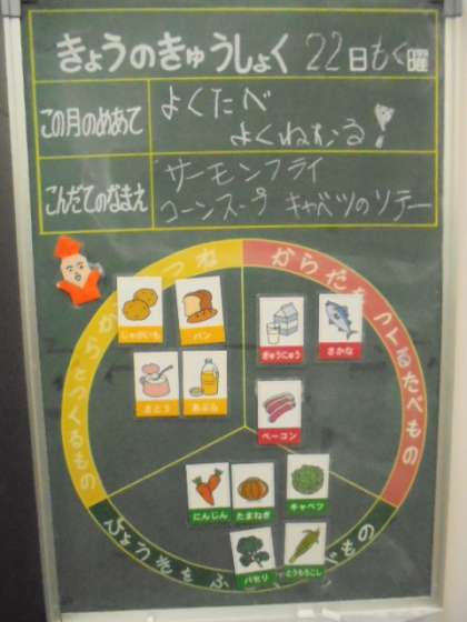 今日の献立は、サーモンフライ、コーンスープ、キャベツのソテー、パン、牛乳です。給食調理室の中は、ものすごい暑さです。作業、ありがとうございます。