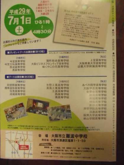 浪速区PTA協議会の主催による恒例の高校進学説明会が開催されます。日時は、7月1日(土)午後1時から午後4時30分。会場は、大阪市立難波中学校です。小学生保護者の皆さんも、ぜひご参加ください!