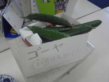 職員室前のゴーヤが大きく成長しました。初収穫です!