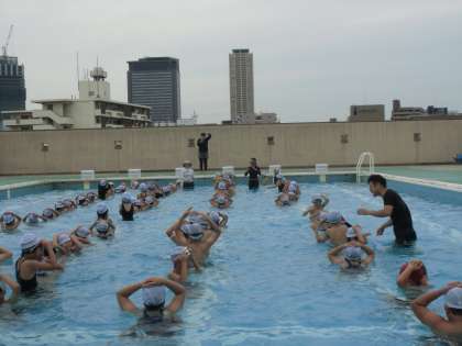 曇り空でしたが、子どもたちは大喜びでプールに入っていました。水慣れの体操や顔つけ、宝探しなどをして楽しみました。