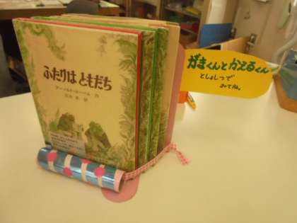 今日は、図書館補助員の小前先生が来られる日です。本を読みやすく並べてくださっています。これは、2年生の国語の教科書にある本です。