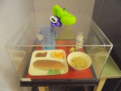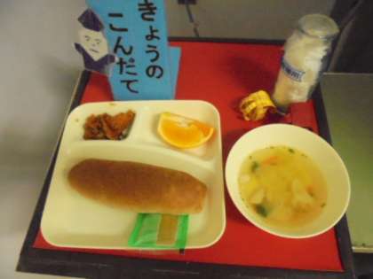 今日の献立は、かぼちゃのミートグラタン、スープ、オレンジ、パン、牛乳です。