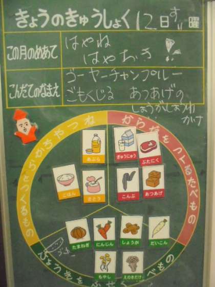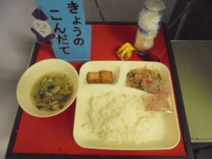 今日の献立は、ゴーヤチャンプルー、五目汁、あつあげのしょうがじょうゆかけ、ごはん、牛乳です。