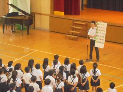1学期最後の終業式です。生活指導部長の細田先生が、「イカのおすし」の話をしてくださいました。同和教育主担の井元先生からは、いのちを大切に、と話していただきました。