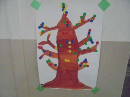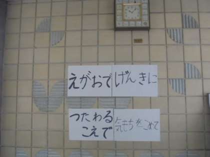 学校に入ってすぐのところに、「えがおで げんきに つたわる声で 気もちをこめて」のめあてをはっています。各学級で、あいさつの木を作っています。
