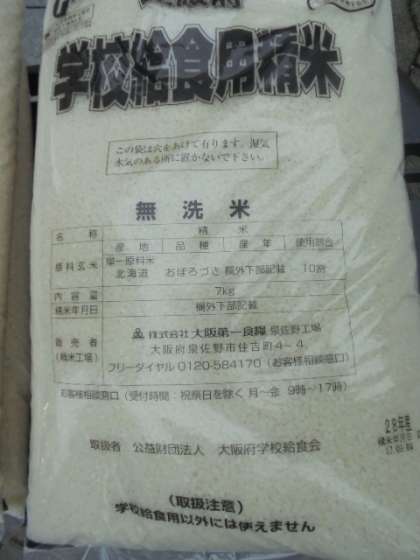 給食用の精米が届きました。銘柄は、北海道の「おぼろづき」です。今日の献立は、