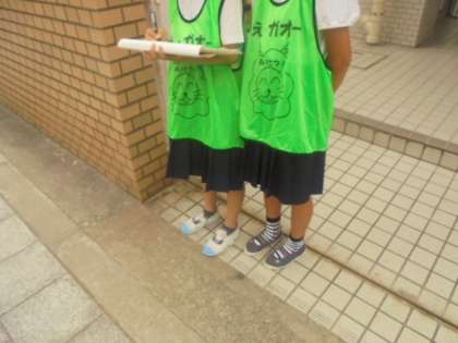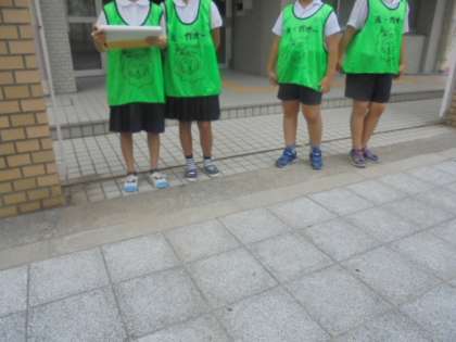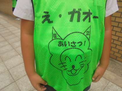 今朝も、児童会代表員会の皆さんが、玄関で元気にあいさつをしています。「え・ガオー」のビブスがいいですね!ありがとう!