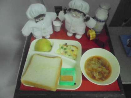 今日の献立は、えびグラタン、トマトスープ、なし(二十世紀)、パン、牛乳です。