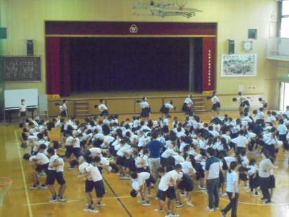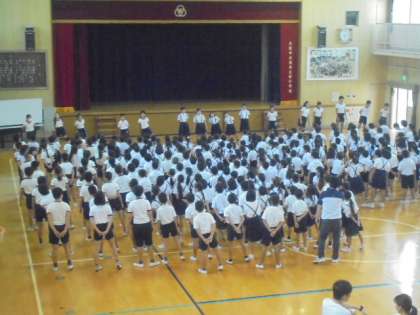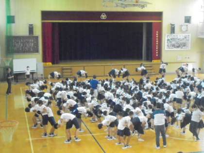 全校朝会の前に、健康委員会の皆さんと一緒に全員で姿勢体操をしました。朝から、気持ちがいいですね。