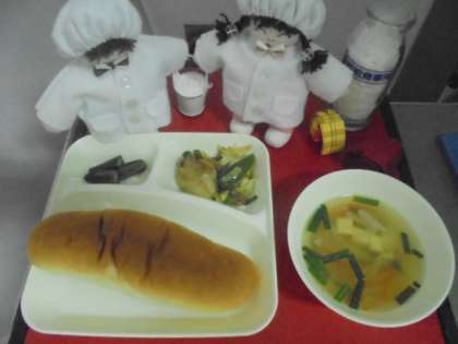 今日の献立は、ホイコウロー、とうふのスープ、オクラの中華あえ、パン、牛乳です。