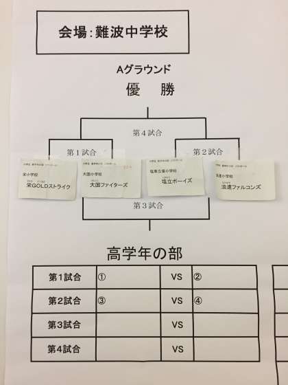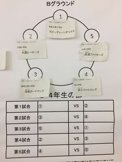 抽選の結果です。ソフトボールの会場は、難波中学校です。(上)5・6年1チーム(下)3・4年2チーム