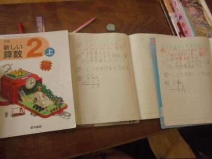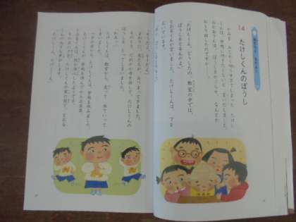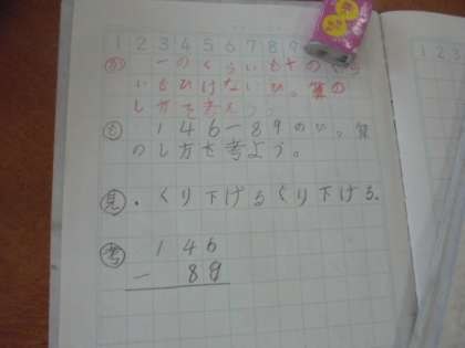 (上)算数で「くりさがりのあるひき算」を学習しています。(下)道徳で「たけしくんんのぼうし」を学習しています。