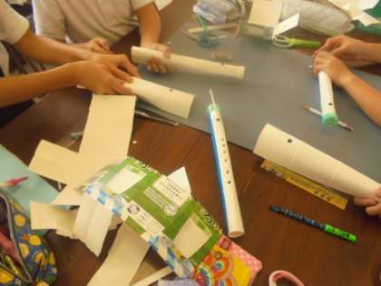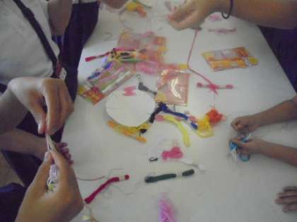 (上)ミュージッククラブ、手作りのリコーダーです!(中)科学クラブ、レーウェンフックの顕微鏡です!(下)手づくりクラブ、ミサンガ作成中!