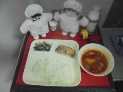 今日の献立は、さけのバジル焼き、大豆とごろごろ野菜のトマト煮、三度豆ともやしのサラダ、ごはん、牛乳です。