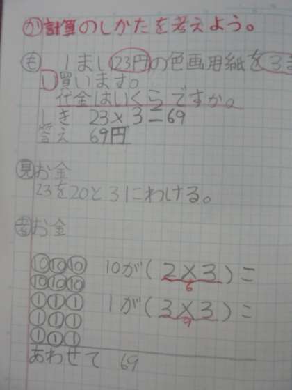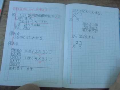 算数の学習で、23×3になる計算問題を勉強しています。先生のノート指導が、素晴らしいです。