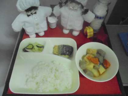 今日の献立は、さごしの塩焼き、じゃがいもと一口がんもの煮もの、キャベツときゅうりのゆずの香あえ、ごはん、牛乳です。