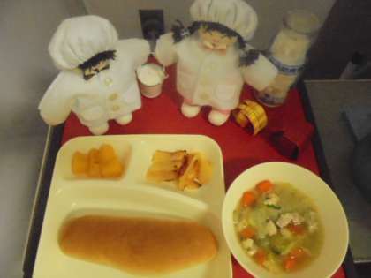 今日の献立は、鶏肉とてぼ豆のスープ煮、じゃがいもとトマトのチーズ焼き、黄桃(カット缶)、パン、牛乳です。