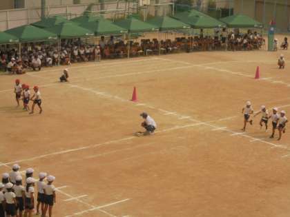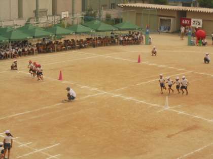 「塩立ハリケーン」。4人で棒を持って、コーンを回り、戻ってきたらお友だちの足の下をくぐらせます。チームワークが大切な競技です。赤、白、がんばれ!!