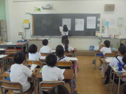 算数の学習です。子どもたちどうしで、考えたことを発表しあっています。