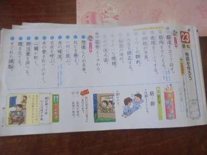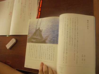 (上)新しく習った漢字を勉強しています。(下)国語の教科書で、立松和平の「海のいのち」を学習しています。