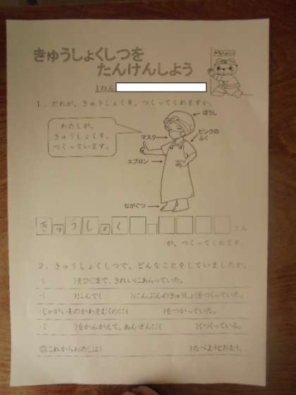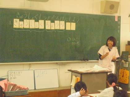 今日は、栄小学校の栄養教諭 四條 利江先生をお招きして、1年生の栄養教室をしました。