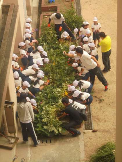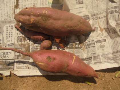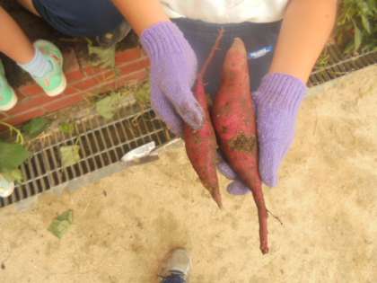 学習園で育てたサツマイモの収穫です。子どもたちは、大きく育ったイモを見て、びっくりしていました。収穫した後は、ツルを使って、縄跳びや綱引きをしたり、リースを作ったりして遊びました。
