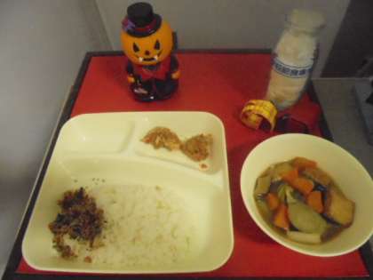 今日の献立は、鶏肉のたつたあげ、あつあげと野菜の煮もの、おかかなっ葉、ごはん、牛乳です。