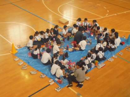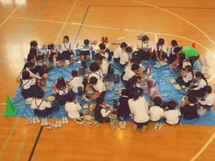 遠足は延期になって残念ですが、体育館でお弁当!みんな大喜びです。