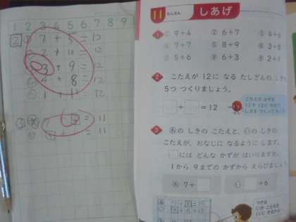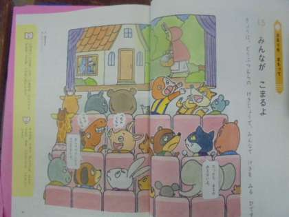 (上)国語「サラダでげんき」を勉強しています。心優しい子どものお話です。(中)算数で、たし算の勉強をしています。(下)道徳で「みんながこまるよ」を学習しました。