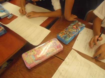 (上)作文を書いて、みんなで読みあっています。(下)算数「長さを小数で表そう」を学習しています。