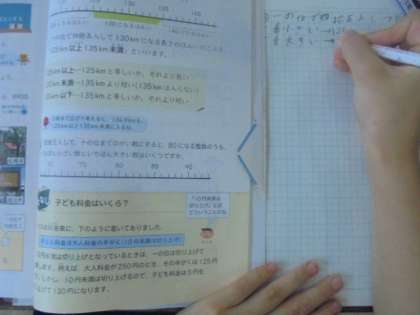 (上)体育で、2人一組になって運動を楽しんでいます。(下)算数で、「以上」「以下」「未満」について学習しています。