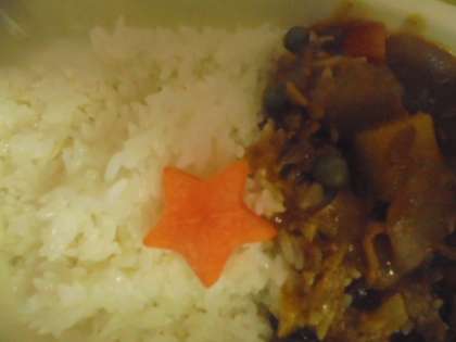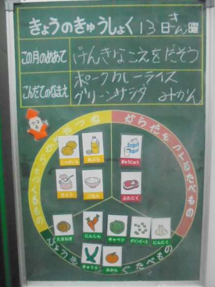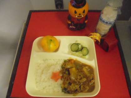 今日の献立は、ポークカレーライス(米粉)、グリーンサラダ、みかん、ごはん、牛乳です。今日は、ラッキーにんじんが入っています。今日のラッキーさんは、だれかな?