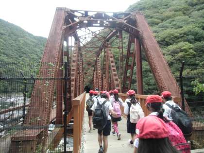 自然の中を歩き始めると「空気がきれい。」と気持ちよさそう。続いて枕木を見ると「汽車になったみたい!」。渓谷を見ると、「きれい!川には、魚がたくさんいそう!」と広がる渓谷美に目を奪われていました。