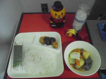 今日の献立は、みそカツ、じゃがいもと野菜の煮もの、焼きのり、ごはん、牛乳です。