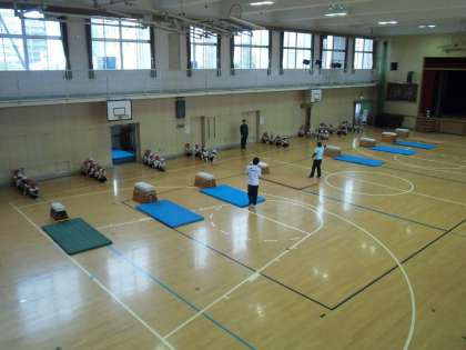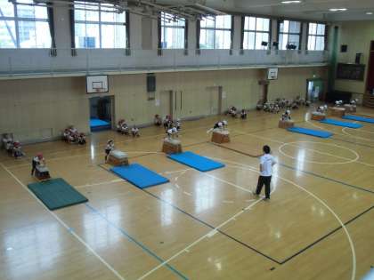 跳び箱の学習です。子どものめあてにあった高さで挑戦しています。