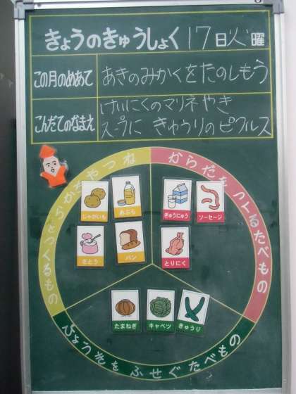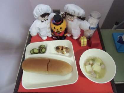 今日の献立は、鶏肉のマリネ焼き(ノンエッグドレッシング)、スープ煮、きゅうりのピクルス、パン、牛乳です。