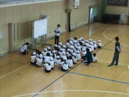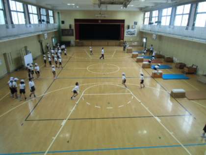 体育館で、跳び箱運動をしています。電子黒板で跳び方を指導した後、子どもたちのめあてに応じた段を用意しています。