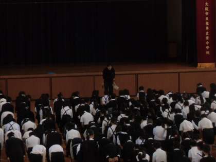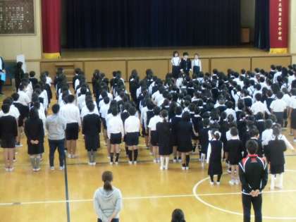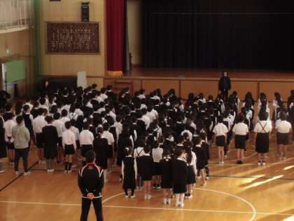 (上)鎌田先生から、給食についてのお話です。(中)大島先生から、「となりの國の学習」について説明です。(下)給食委員会の子どもたちから連絡です。今週は「残さず食べよう週間」です。