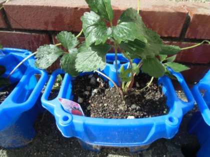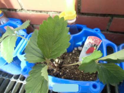 鉢でいちごを育てています。赤い実ができるといいですね。