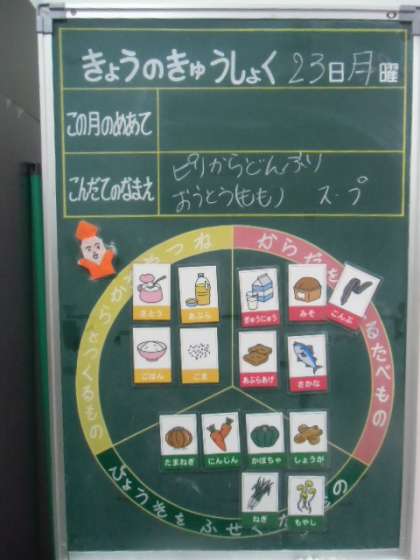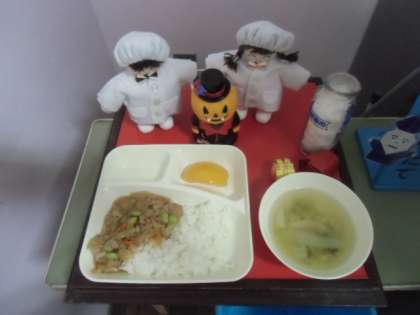 今日の献立は、ピリ辛丼、中華スープ、黄桃(缶)、ごはん、牛乳です。