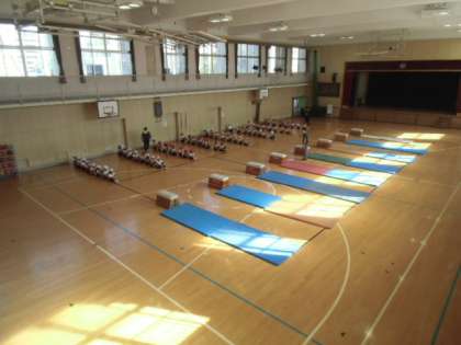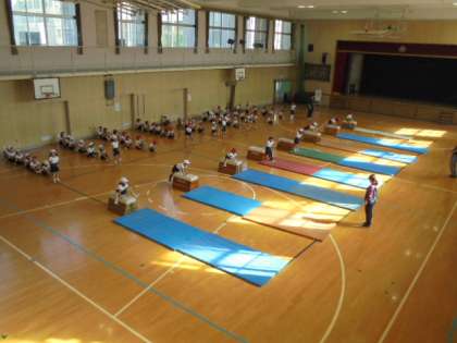 体育館で、跳び箱をがんばっています。タイミングよく跳んでいます!先生方の模範演技も、すばらしい!!