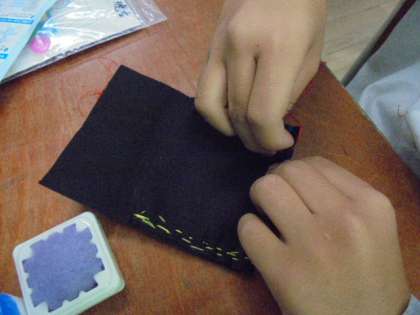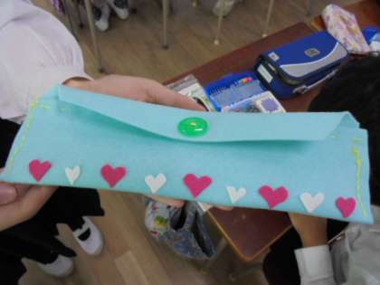 家庭科の小物づくりをしています。一人ひとり、違ったいい作品です。
