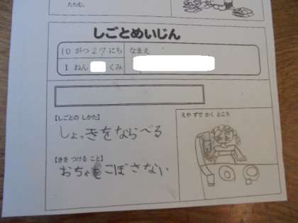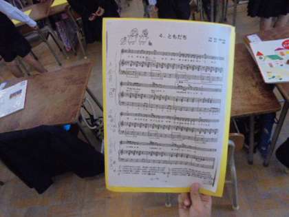 (上)教室から、「ともだち」の元気な歌声が響いてきました。(下)生活科で、家のしごとしらべをしています。