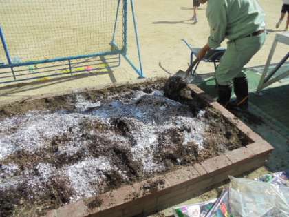 管理作業員の小林さんが、花壇を手入れしてくださっています。白く見えるのは、石灰です。
